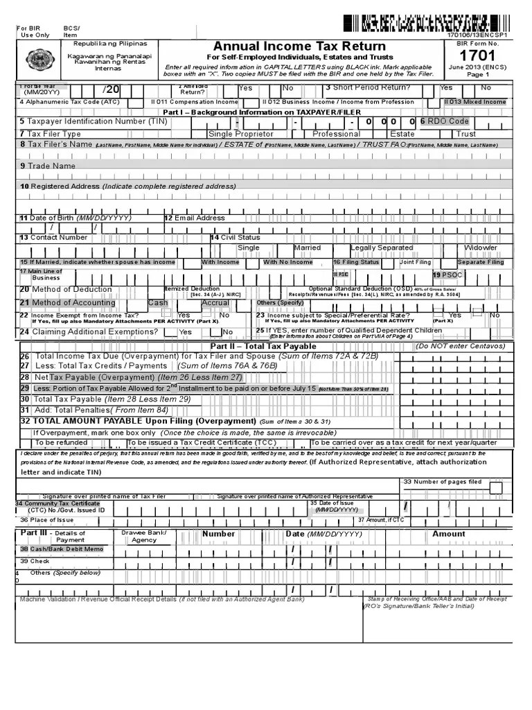 Annual income tax return for. This return shall be filed in triplicate by the. Enter all required information in capital letters using black. Annual income tax return for individuals (including mixed income earner), estates and trusts: 1701 for filing annual income tax return for individuals engaged in trade/business or profession. 1701 june 2013 (encs) 170106/13encsp5 tin tax filer’s last name 0.