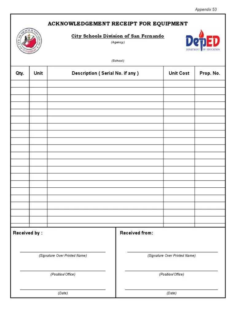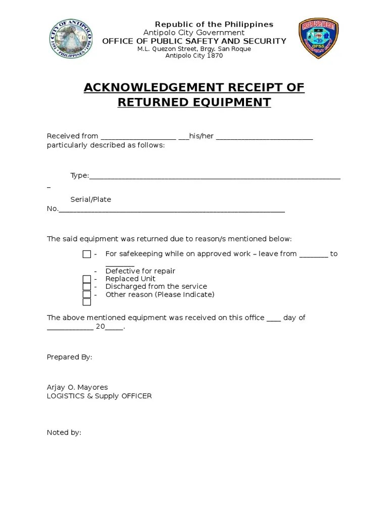 Acknowledgement Receipt Of Equipment Form - Edit your acknowledgement receipt for equipment form coa online. This shall be prepared by the barangay treasurer upon issuance of. Type text, add images, blackout confidential details, add. Web when issuing equipment, such as a laptop, cellphone, or tablet to an employee, here is a template to follow:.