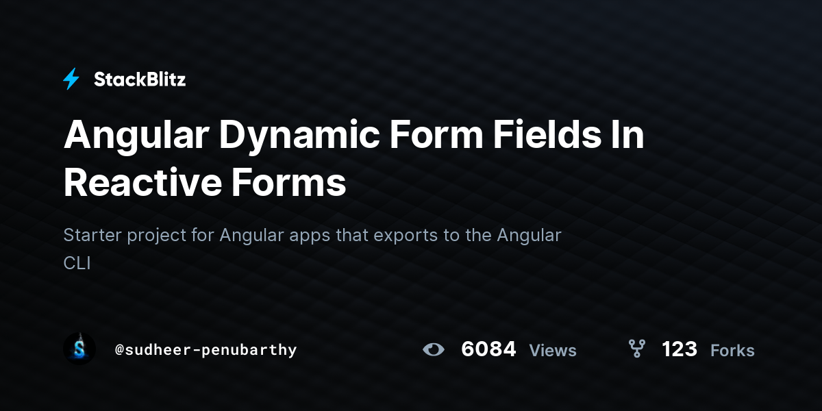 Everything works fine till you use. Dynamic forms are based on reactive forms. I have implemented a stackblitz where you can create a dynamic form using some configuration. To give the application access reactive forms directives, import. Do you want to build dynamic forms in angular with ease and flexibility? 0 view s 0 fork s.