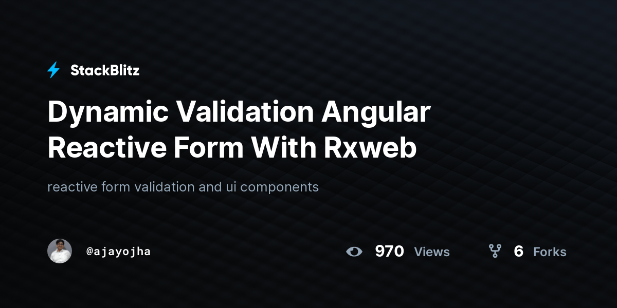 Dynamic Form Angular Stackblitz - Everything works fine till you use. Dynamic forms are based on reactive forms. Do you want to build dynamic forms in angular with ease and flexibility? 0 view s 0 fork s. To give the application access reactive forms directives, import. I have implemented a stackblitz where you can create a dynamic form using some configuration.