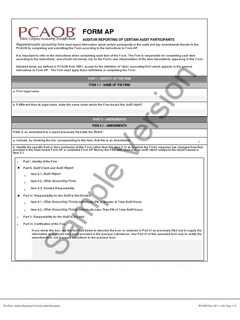 Form Ap Pcaob - The board also launched a webpage. The pcaob staff provided implementation guidance for form ap in a document, staff guidance, form ap, auditor. The pcaob staff guidance provides information on completing form ap and covers other provisions of the recently enacted rules. Pcaob rule 3211, auditor reporting of certain audit participants, requires independent registered public accounting firms to file a. Form ap, auditor reporting of certain audit participants, is available on the pcaob website. The pcaob's form ap (audit personnel) includes the identity of the engagement partner, an indication of whether.
