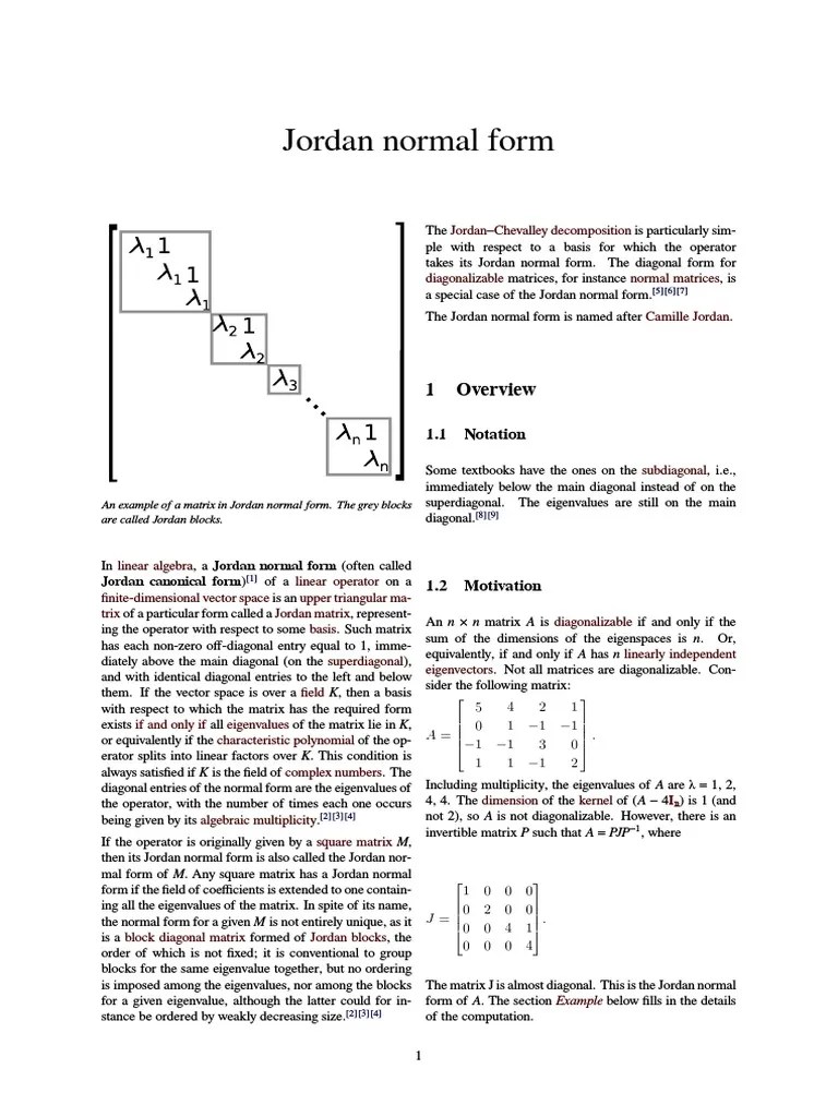 A jordan block is a square matrix b whose diagonal entries consist of a single scalar λ, whose. For a rst example, we determine the jordan form of the operator represented by the matrix a= 0 @ 1 1 0. The jordan form jmay contain several jordan blocks for one eigenvalue. To illustrate, if j has only one eigenvalue and algmult( ) = 3, then. Examples of jordan forms example 1.