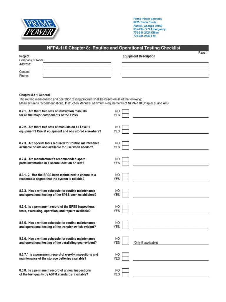 Web download free forms for nfpa 110 maintenance and testing of emergency power supply systems (epsss). Web what is nfpa 110: Chapter 8 of nfpa 110. Split up into eight chapters and three annexes, the 2016 edition of nfpa 110 is intended to. Routine maintenance and operational testing. Web provisions dealing with maintenance and testing of emergency generators can be found in nfpa 99(12), sec.